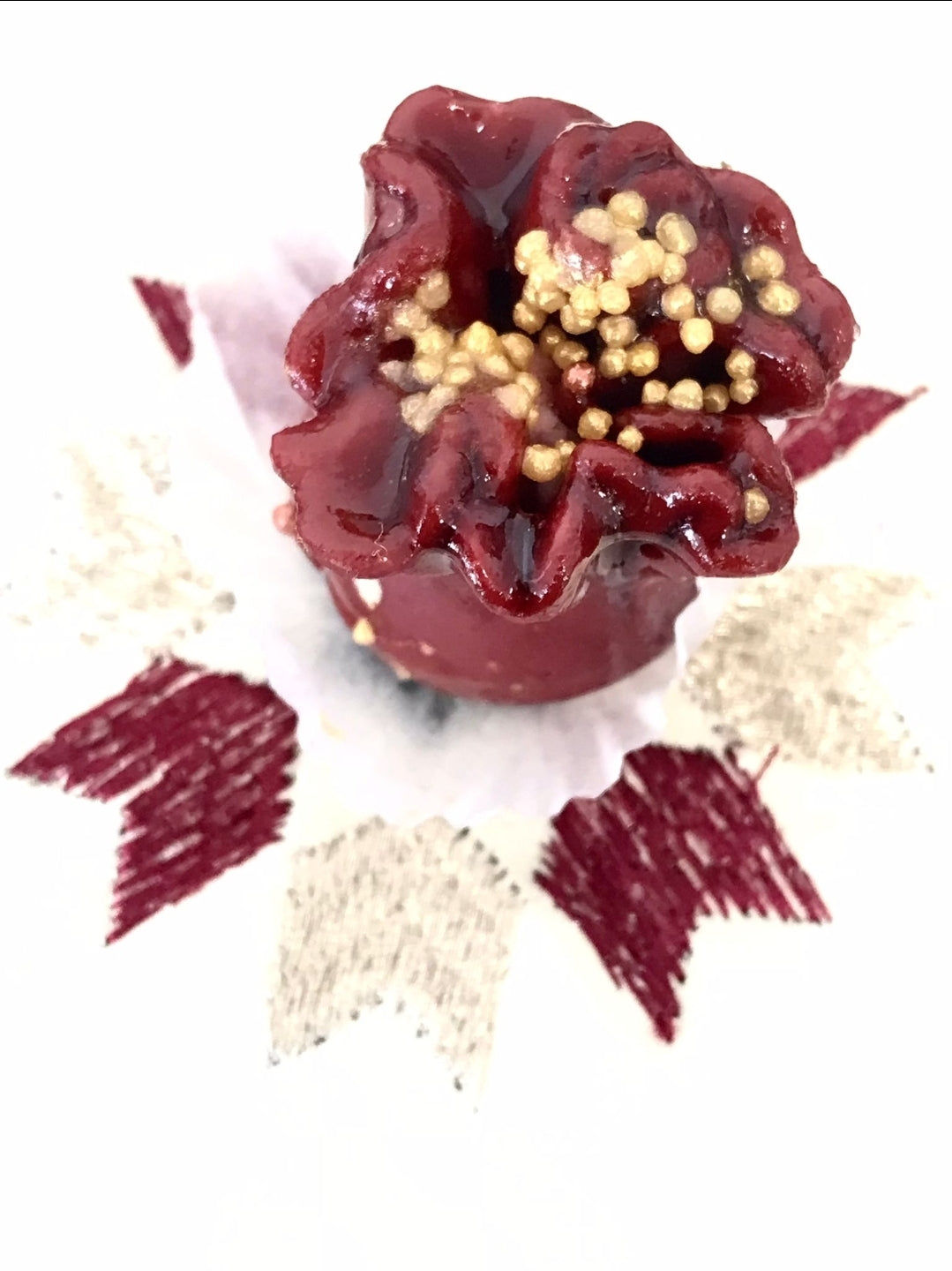 Bourse à base de de pâte d'amande, fleur de rose et nappage confiture de cerise.