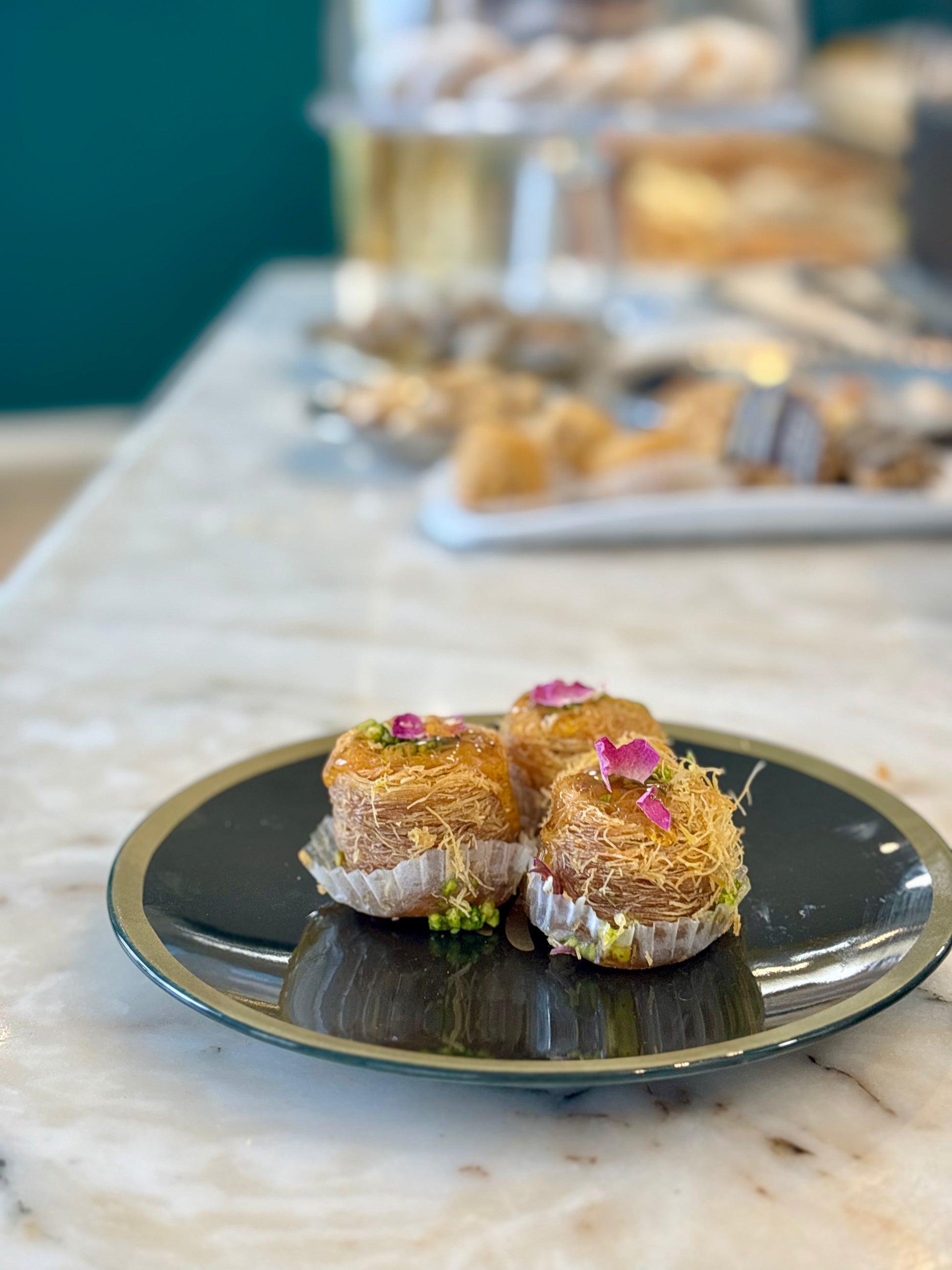 Pâte kadaïf finement tressé, miel, pistache, amande.