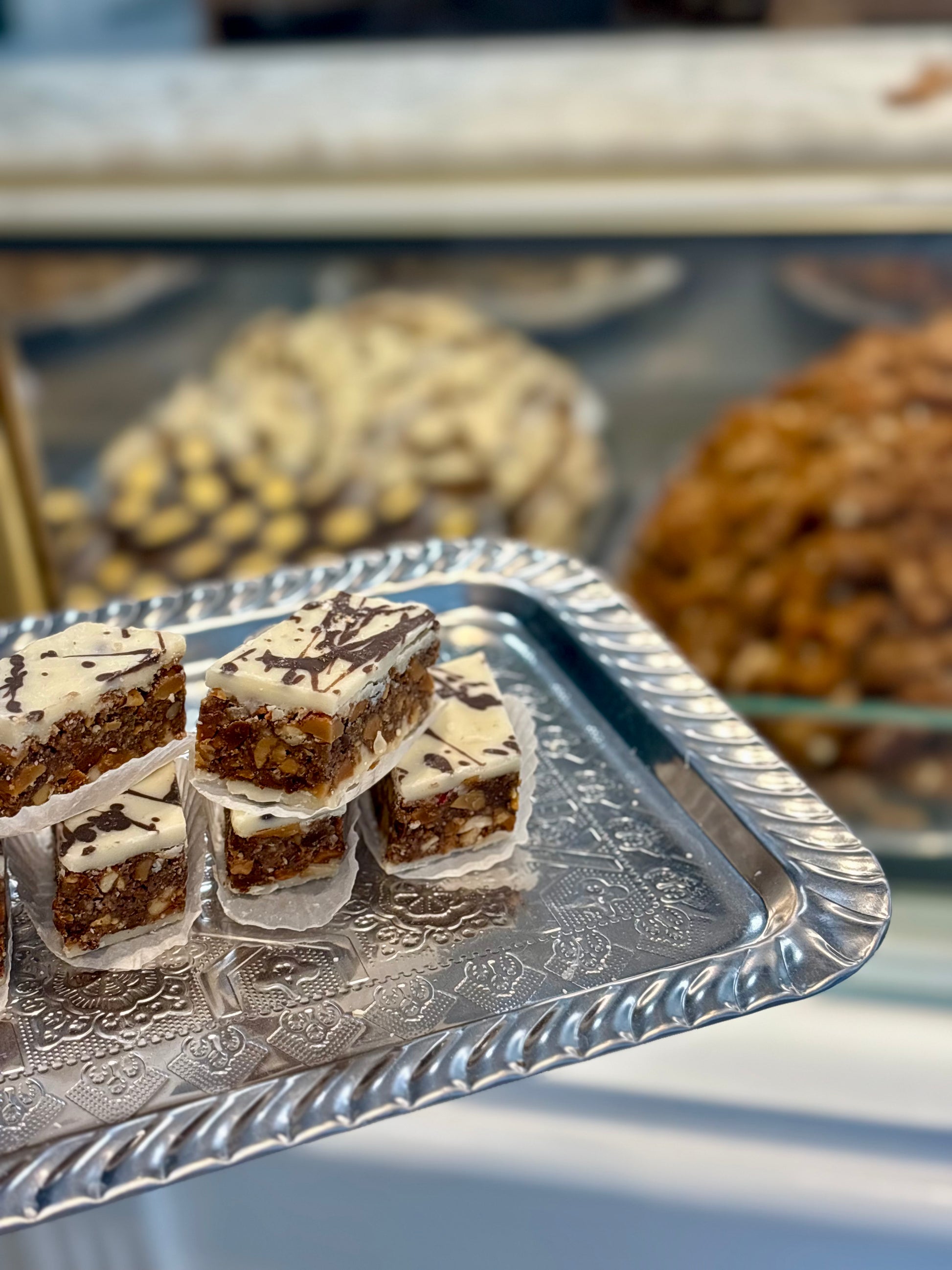Cacahuètes concassées mélangé amande, fleur d'oranger, chocolat blanc et noir.